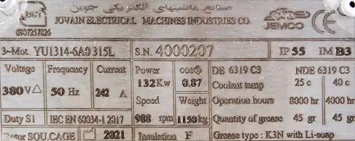 ویژگیهای فنی الکتروموتور جمکو 180 اسب 132 کیلووات 1000 دور